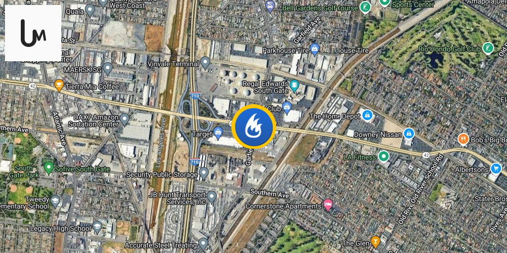 2ND ALARM STRUCTURE FIRE BN 13 E54 Firestone Blvd/Garfield Ave South Gate Units dispatched 1:16 a.m. LACoFD First units onscene 1:19 a.m. to 1 story commercial building fire. Upgraded to 2nd alarm